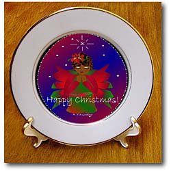 African-American Christmas Angel Baby Girl Praying With Happy Christmas Text Plate is new and handcrafted utilizing a unique process resulting in a stunning high gloss finish. White porcelain plate measures 8.25 inches in diameter, trimed with two 24 kart gold rims and comes with a stand.