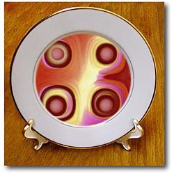 Abstract brown suns on a orange pink and yellow background Plate is new and handcrafted utilizing a unique process resulting in a stunning high gloss finish. White porcelain plate measures 8.25 inches in diameter, trimmed with two 24 karat gold rims and comes with a stand.